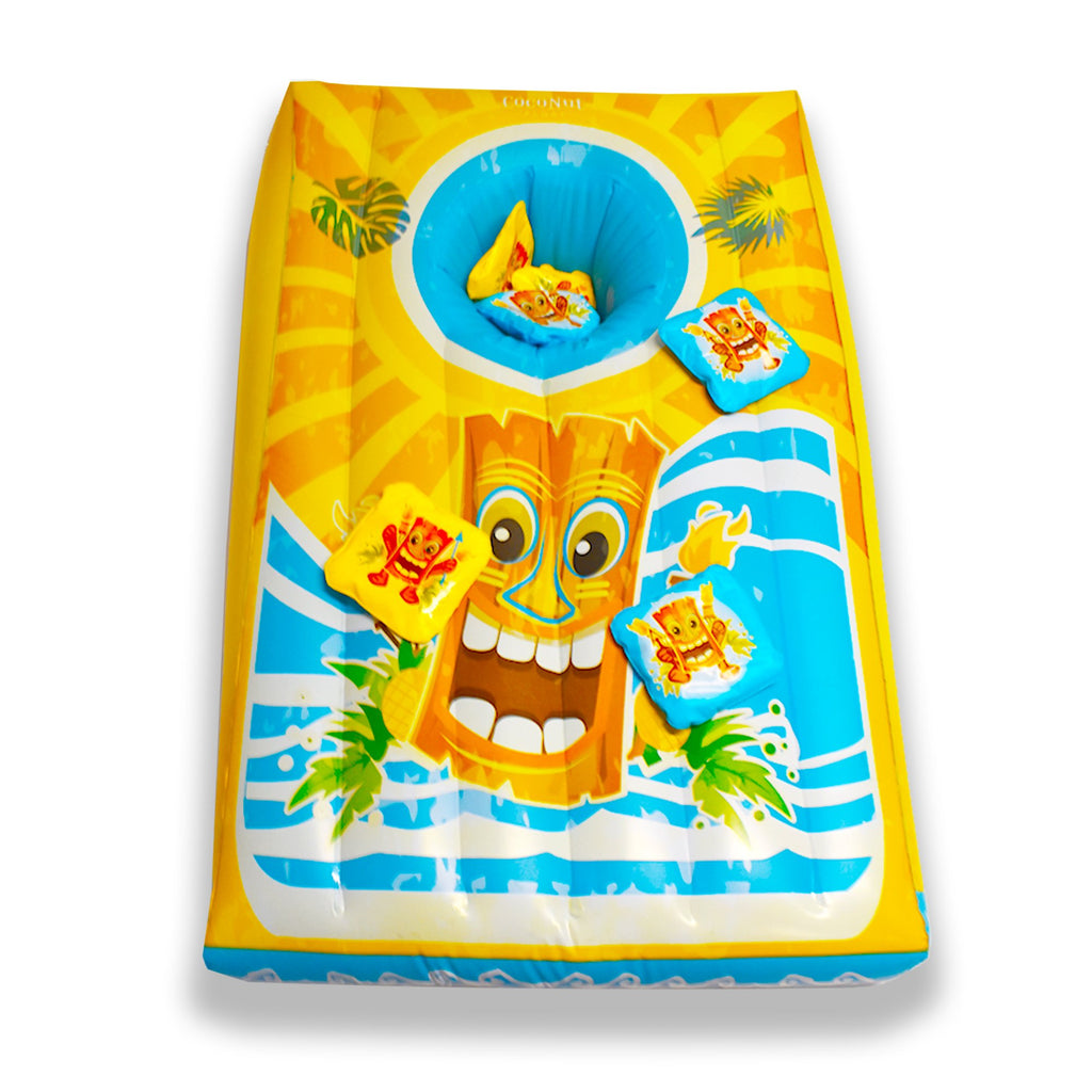 Toss, throw, chuck, all is allowed with this Island Toss Cornhole Game! So fun, you'll be challenging your friends and family all summer! Each bean bag has points on the back so you can toss them into the pool for a fun additional swim game! Includes 1 inflatable cornhole game, 4 blue bean bags and 4 yellow bean bags. Can be used in the pool, on the grass and on the beach! Perfectly sized, this inflatable game measures 37 inches long and 23 inches wide. Made of heavy-duty, durable 0.25mm vinyl, this float is built to last and resist punctures. For ages 5 and up. WARNING: CHOKING HAZARD - Small Parts. Not for children under 3yrs.