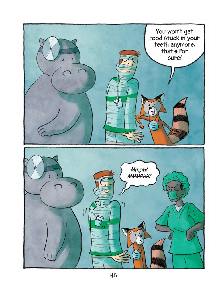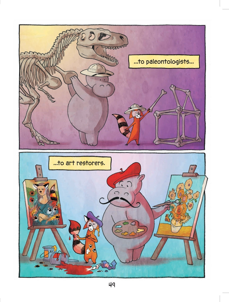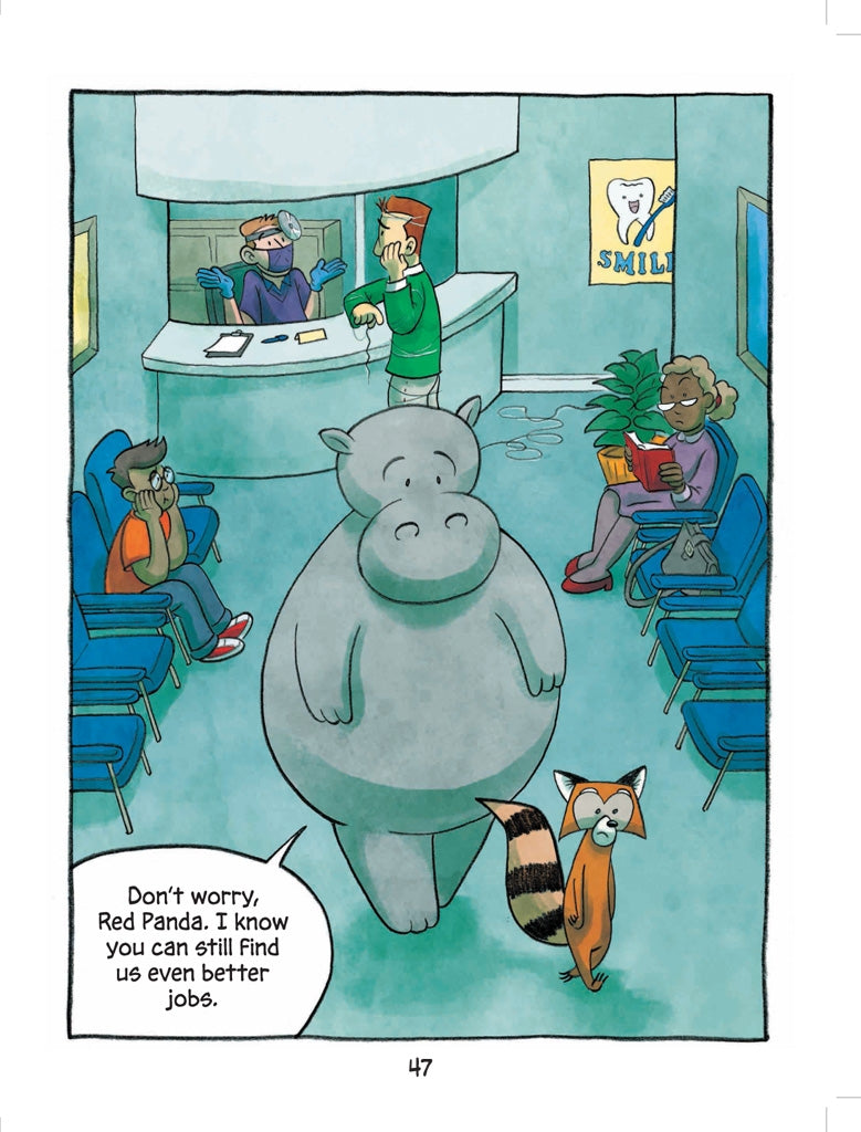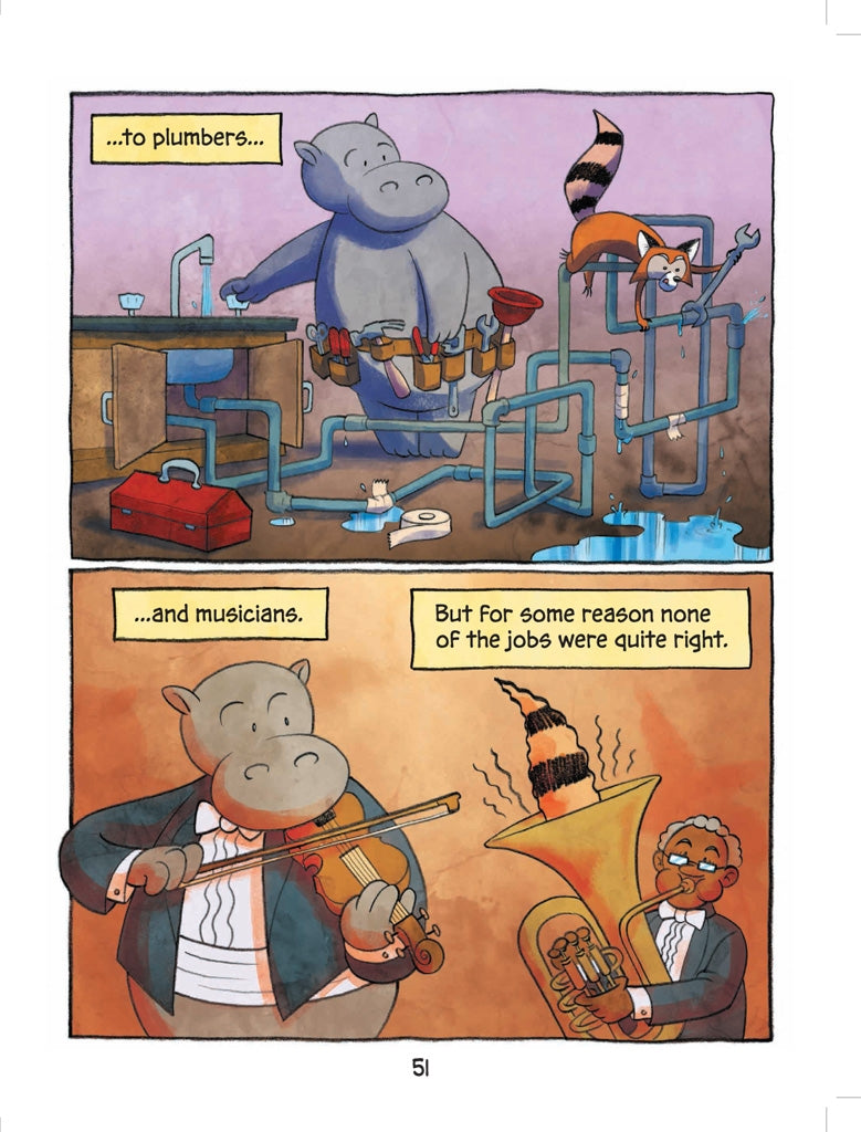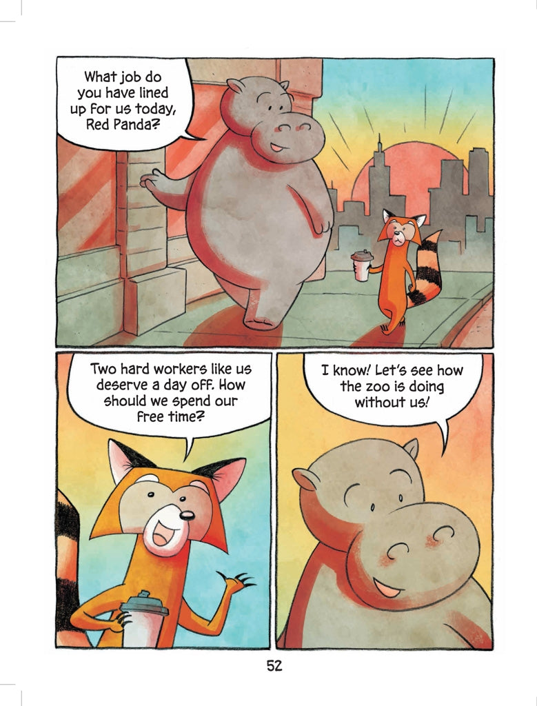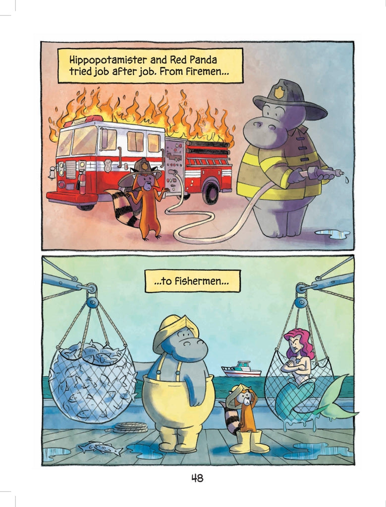 By John Patrick Green, Author & Illusrator. The zoo isn't what it used to be. It's run down, and Hippo hardly ever gets any visitors. So he decides to set off for the outside with his friend Red Panda. To make it in the human world, Hippo will have to become a Hippopotamister: he'll have to act like a human, get a job, and wear a hat as a disguise. He's a good employee, whether he's a construction worker, a hair stylist, or a sous chef. But what he really needs is a job where he can be himself. For ages 5 and up.