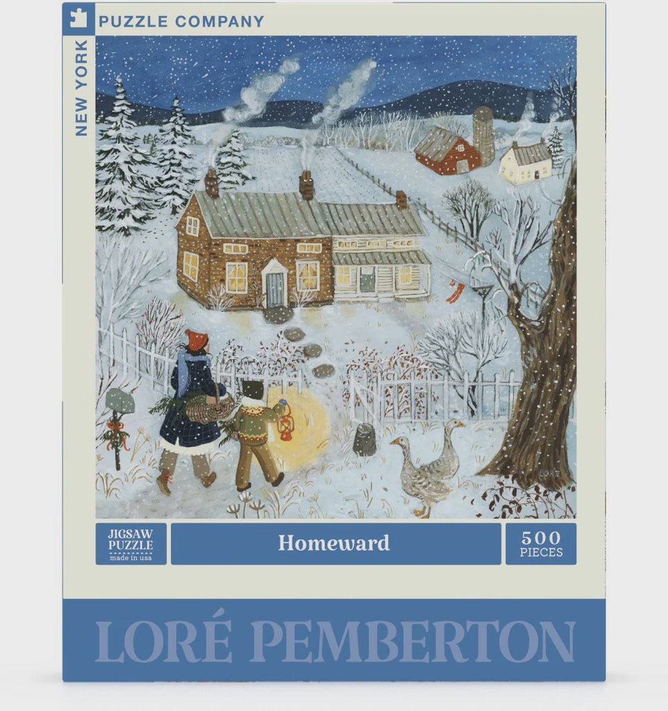 Embrace the warmth of winter with Homeward, a bestselling 500-piece jigsaw puzzle by artist Loré Pemberton. This heartwarming scene captures a mother and her child journeying home on a snowy day, carrying a basket of treats as they pass a pair of curious ducks. With its gentle details and nostalgic charm, Homeward transports you to a simpler time filled with love, family, and the cozy comforts of home.