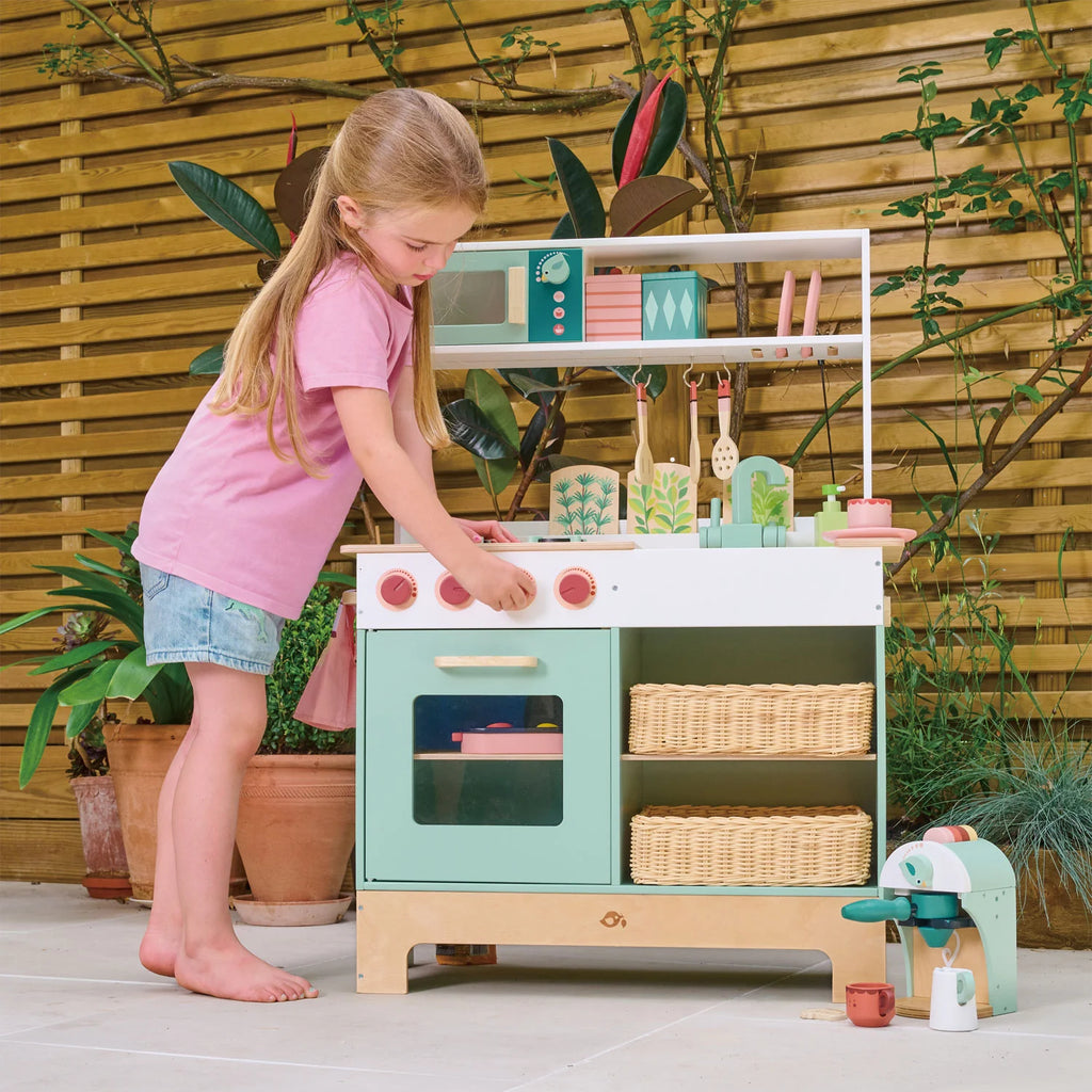 With an oven and integral microwave and plate rack, this kitchen range is made extra special with a multitude of original accessories. 2 wicker baskets provide lots of storage space for other pretend play food within the mini chef range, 2 wooden storage jars, 3 racks of herbs, 3 pretty plates, a printed gingham potholder, a printed mini chef tea towel, and 3 cooking utensils. Pretend play food here is a delightful 2 part fish with garnishes in an oval fish pan. Lastly but not least, don’t forget to wash your hands at the sink with a handy soap dispenser! Assembly required, For Ages 3 and up. WARNING: CHOKING HAZARD - Small Parts. Not for children under 3yrs.