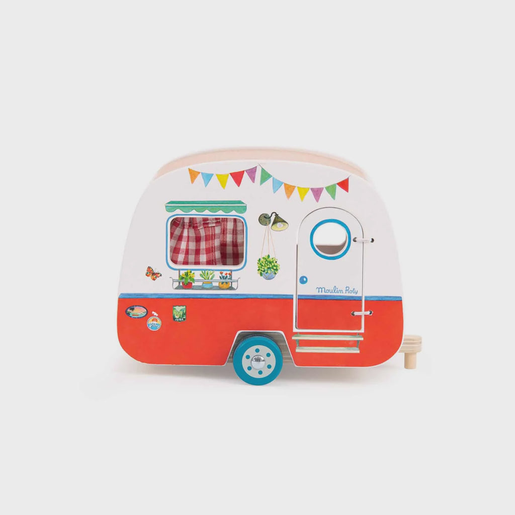 The Big Family are off on holiday in their caravan! Made entirely of wood, it features a furniture set, gingham fabric curtains and a removable roof for nights under the stars. For Ages 3 and up. WARNING: CHOKING HAZARD - Small Parts. Not for children under 3yrs.