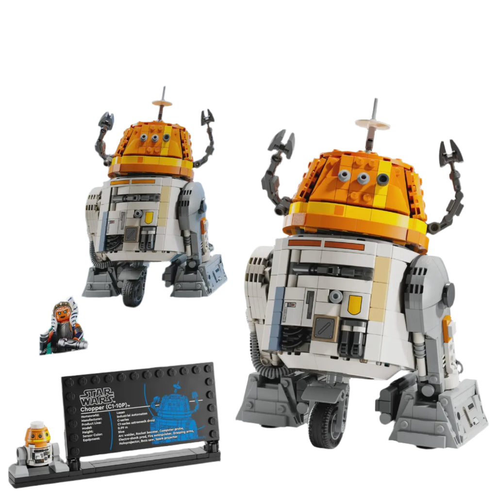 This collectible LEGO Star Wars build-and-display set is complemented by a standard-size Chopper LEGO droid figure, which can be placed on the standnext to the Chopper information plaque to complete an eye-catching centerpiece. For Ages 10 and up. WARNING: CHOKING HAZARD - Small Parts. Not for children under 3yrs.