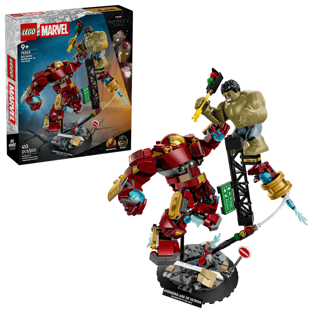 Bring Marvel Studios’ Avengers: Age of Ultron action to life with the LEGO® ǀ Marvel Epic Battle: Hulkbuster vs. The Hulk (76343) building set for boys and girls ages 9 and up. Featuring Iron Man and Hulk minifigures, plus the iconic Hulkbuster armor, this stunning building set offers kids endless opportunities for imaginative role play and creative display. Iron Man battles Hulk, with the help of his Hulkbuster armor, amid a street scene filled with debris, collapsing steel structures and a traffic light, which Hulk can use as a weapon. The Hulkbuster is fully jointed to maximize posability. With a sturdy base and nameplate, kids can use their model as room decor or detach the minifigures to create Super Hero adventures of their own. This set makes a great gift idea and, with the LEGO Builder app, kids can build with confidence – zoom, rotate in 3D and track progress with easy-to-follow digital instructions. Building set contains 413 pieces. For Ages 9 and up. WARNING: CHOKING HAZARD - Small Parts. Not for children under 3yrs.