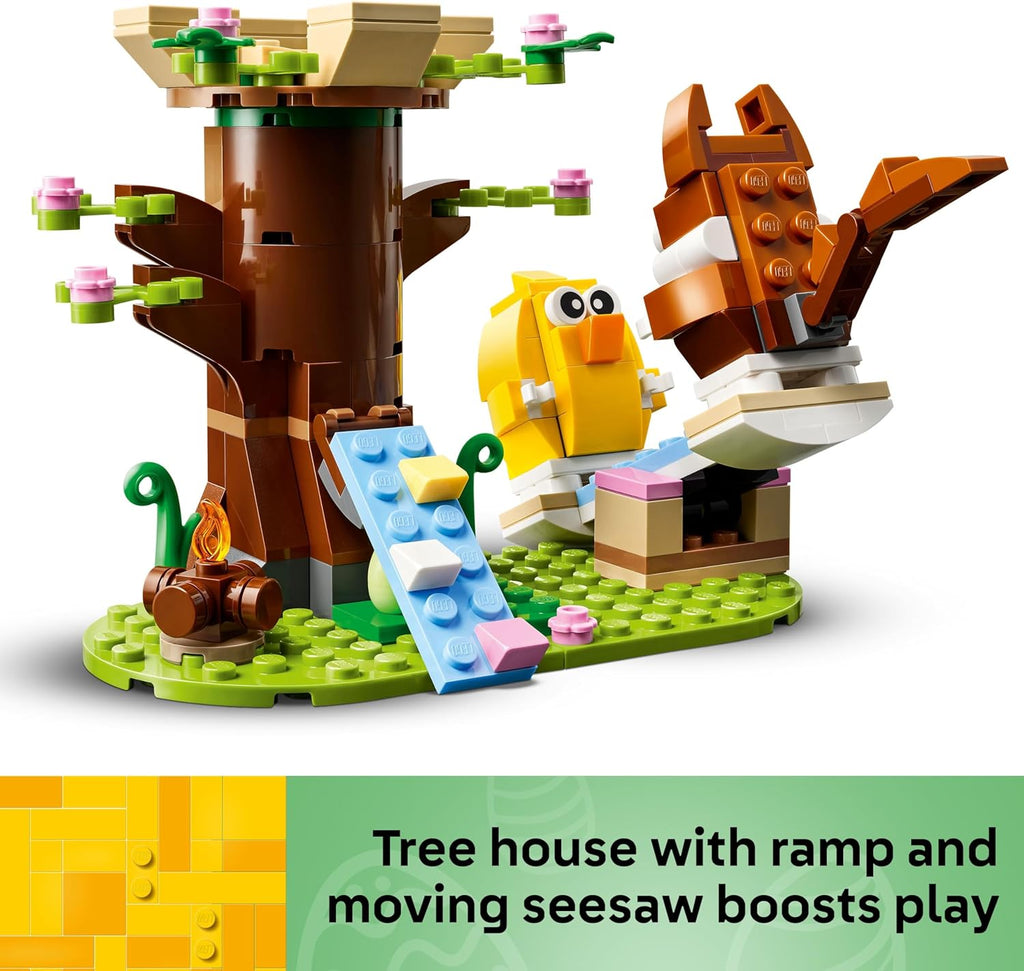 Celebrate Spring with this fantastic LEGO animal toy packed with cool features. The Spring Animal Playground (40709) set lets boys and girls ages 8 and up stage fun-filled stories with a squirrel toy, bird toy, tree house, campfire, seesaw and 2 Easter eggs. Playful kids can walk the squirrel and bird up the ramp and perch them on top of the tree house, seat them around the campfire and take them for a ride on the moving seesaw. There is also space under the ramp and behind the tree house for fun hide-and-go-seek playtime. This colorful LEGO model set makes a great springtime or Easter gift and can be added to other LEGO animal playsets (sold separately) so kids can enjoy even bigger adventures. It also looks great displayed on a shelf or bedside table once playtime is over. Contains 172 pieces.