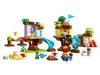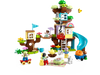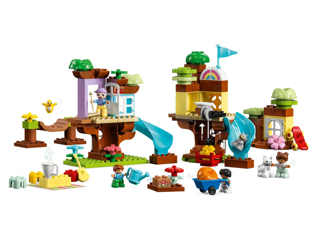 First kids build the ultimate adventure play area with 3 levels, a super-long slide and a wobbly bridge to cross. If rain clouds gather, the model reconfigures as a cozy treehouse. The third model consists of 2 tree houses, each with a slide, and a garden where kids help collect the fruit and haul it up to the tree house using the cute pulley.