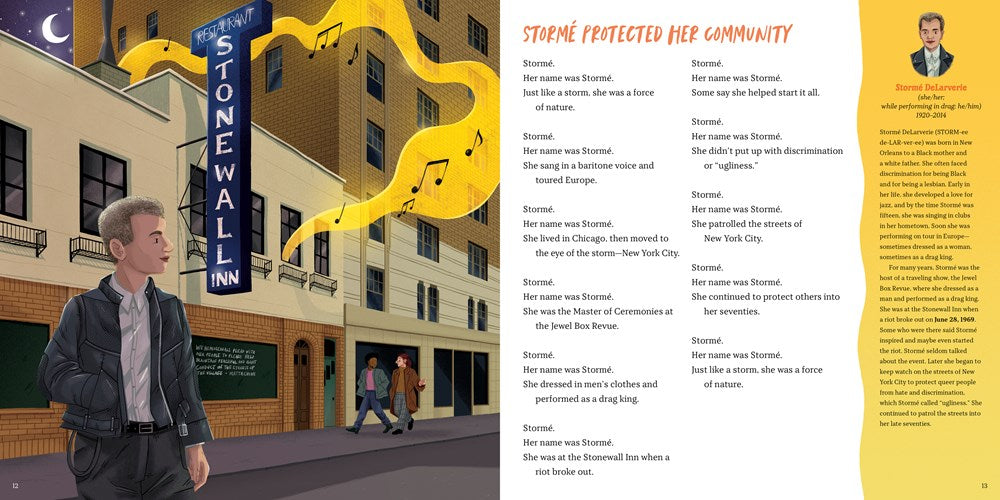 Young readers will learn about the lives and legacies of seventeen heroes of the queer community from both past and present. Marsha P. Johnson, Harvey Milk, Cleve Jones, Pauline Park, Richard Blanco, and Pete Buttigieg are just a few of the iconic figures represented in this wonderfully designed and colorful picture book with illustrations by Harry Woodgate. A perfect introduction to the people who have stood up for what they believed in, lived lives according to their own ideals, and their partners, friends, and allies, the poetry in this book provides great read-aloud potential sure to entertain and inform readers of all ages.