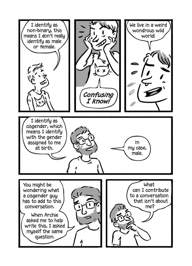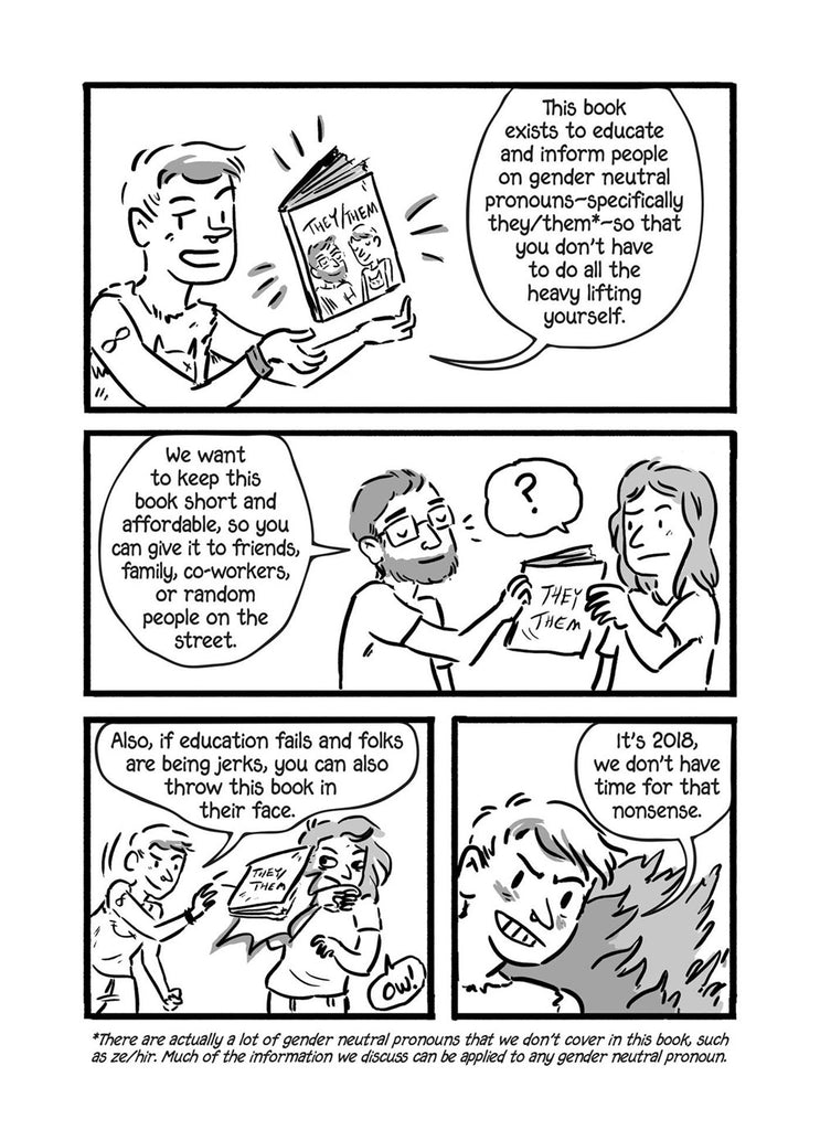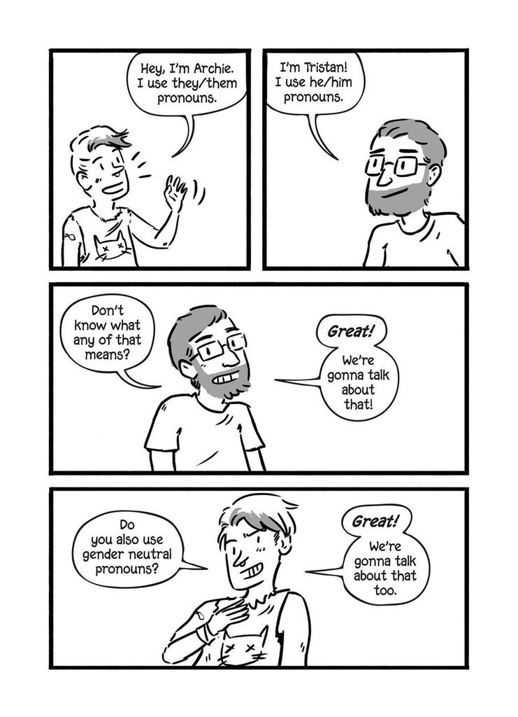 By Tristan Jimerson, Author & Archie Bongiovanni, Author and Illustrator. A quick, easy and important educational comic guide to using gender-neutral pronouns. Archie, a snarky genderqueer artist, is tired of people not understanding gender neutral pronouns. Tristan, a cisgender dude, is looking for an easy way to introduce gender neutral pronouns to his increasingly diverse workplace. The longtime best friends team up in this short and fun comic guide that explains what pronouns are, why they matter, and how to use them. They also include what to do if you make a mistake, and some tips-and-tricks for those who identify outside of the binary to keep themselves safe in this binary-centric world. A quick and easy resource for people who use they/them pronouns, and people who want to learn more!