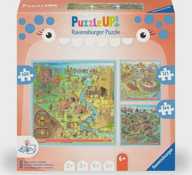 Give your young child a fun introduction to valuable new skills with our “PuzzleUP!” jigsaw puzzle sets! Our “History” set of puzzles features increasing piece counts to help ensure early success. Start with the 100-piece Stone Age puzzle. Then, as their skills develop, build the 121-piece Ancient Rome and 144-piece Middle Ages puzzles. Watch them smile with each success! Small hands can easily hold the large, durable pieces to ensure lasting play value and lots of repeat fun! For Ages 6 and up. WARNING: CHOKING HAZARD - Small Parts. Not for children under 3yrs.