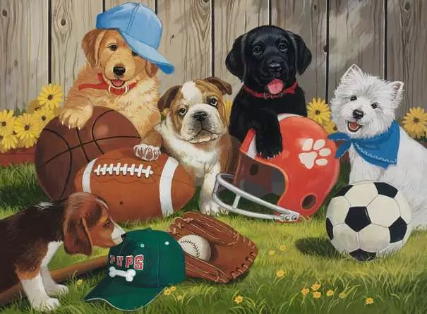 Score one for cuteness! Adorable golden retriever, bulldog, black lab, Westie, and beagle pups are ready for action in our “Let’s Play Ball!” puzzle!