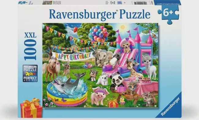 Give your child a gift with lots of repeat fun with our “Tiara Birthday Party” puzzle, set under the sun! All the animals are decked out in their finest jewels, even the dolphin swimming in the cool little pool. The piggy, panda and polar bear are hoping for cake, while giraffe (who missed his nap) can hardly stay awake! Puppy and penguin are going down the slide, and pony would be happy to give you a ride. In the middle is a cute little pup, who knows this puzzle is great for ages 6 and up!