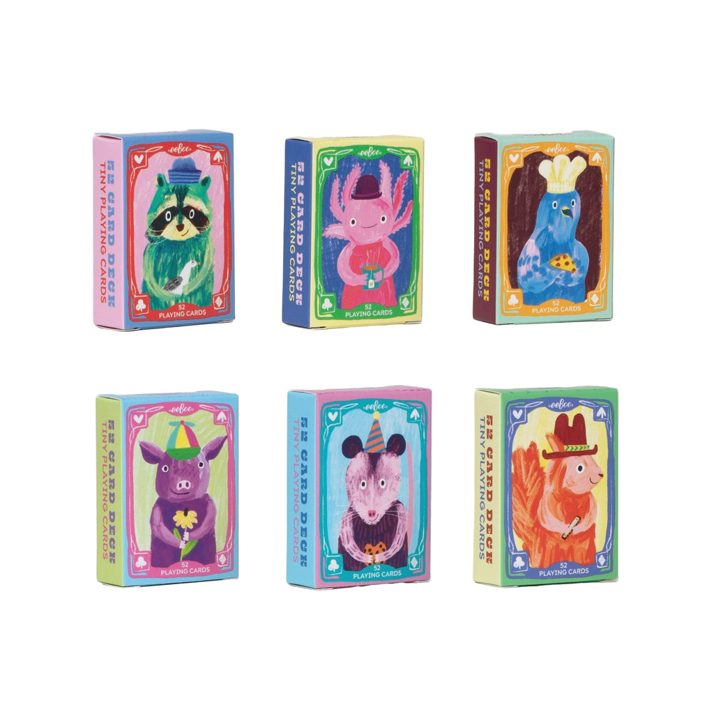 A playful and adorable assortment of tiny playing card sets. Six different designs feature an Axolotl, Opossum, Pigeon, Pig, Raccoon & Squirrel, all illustrated by Katie Vernon. Perfect for birthday party favors, stocking stuffers, or just for fun. Assorted styles chosen at random. You receive 1 deck of cards per order.