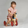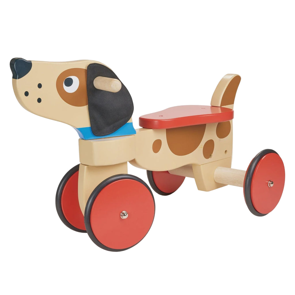 A sturdy ride-on dog toy with fabric ears, that can be rolled along on 4 wheels.
