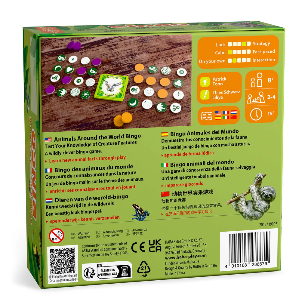 A wild twist on a classic game! Bingo meets brainpower in this fast-paced, knowledge-packed game of animal facts! In Animals Around the World Bingo, players draw animal cards and race to identify key characteristics, like habitat, movement, diet, and more.
