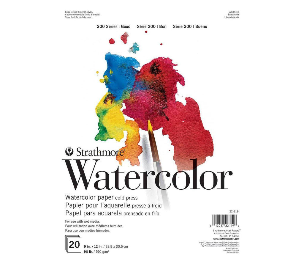 This light weight (90lb.), student grade watercolor paper has a cold press surface and is good for water-based media including watercolor, tempera, acrylic, gouache or poster paint. Pad shown in image is 9x12. You will receive an 11x15in pad.