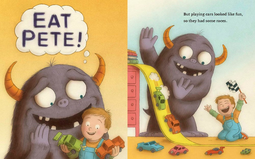 Pete couldn’t be more thrilled when a monster shows up in his bedroom. Now Pete has someone to play with! And the hungry monster couldn’t be more thrilled to be there, either. Now he can . . . EAT PETE! But Pete has other ideas. And they are all good fun and quite distracting—things like playing cars and pirates. But we all know the course of playing together nicely never did run smoothly. So how much longer will the monster have to wait before he can . . . EAT PETE? For Ages 2 and up.