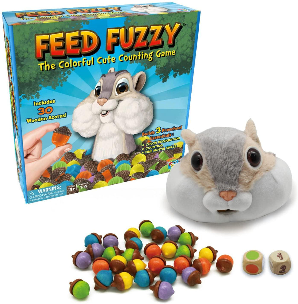 Roll the jumbo wooden dice. Do you have the colored wooden acorns that match what you rolled? If so, it’s time to Feed Fuzzy! Feed him all your acorns first and win! For 1-4 players. For ages 3 and up. WARNING: CHOKING HAZARD - Small Parts. Not for children under 3yrs.