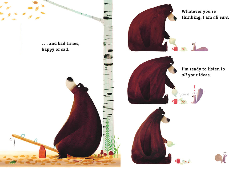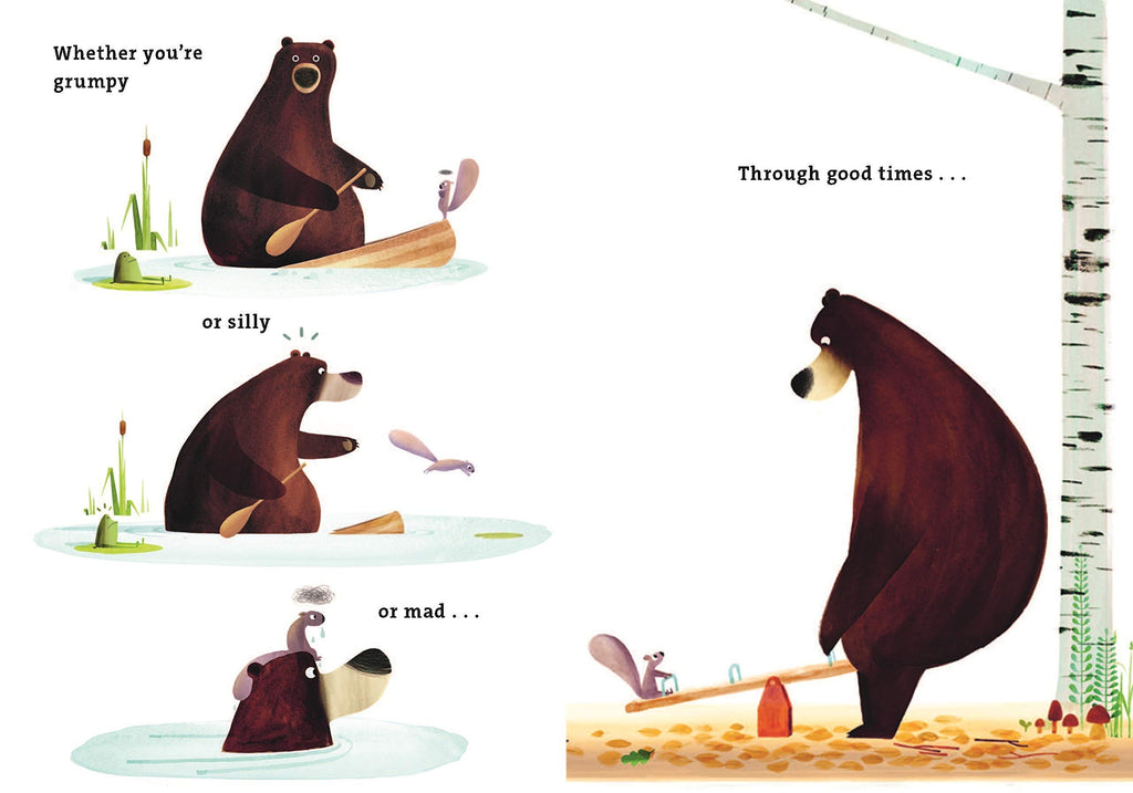 By Smriti Prasadam-Halls, Author & Steve Small, Illustrator. Bear and Squirrel are best friends. Wherever Squirrel goes, Bear follows. Bear vows to stick with Squirrel whether he’s grumpy, or silly, or mad - which is put to the test when Bear sinks Squirrel’s canoe. And catapults him from the seesaw. And breaks his favorite mug.