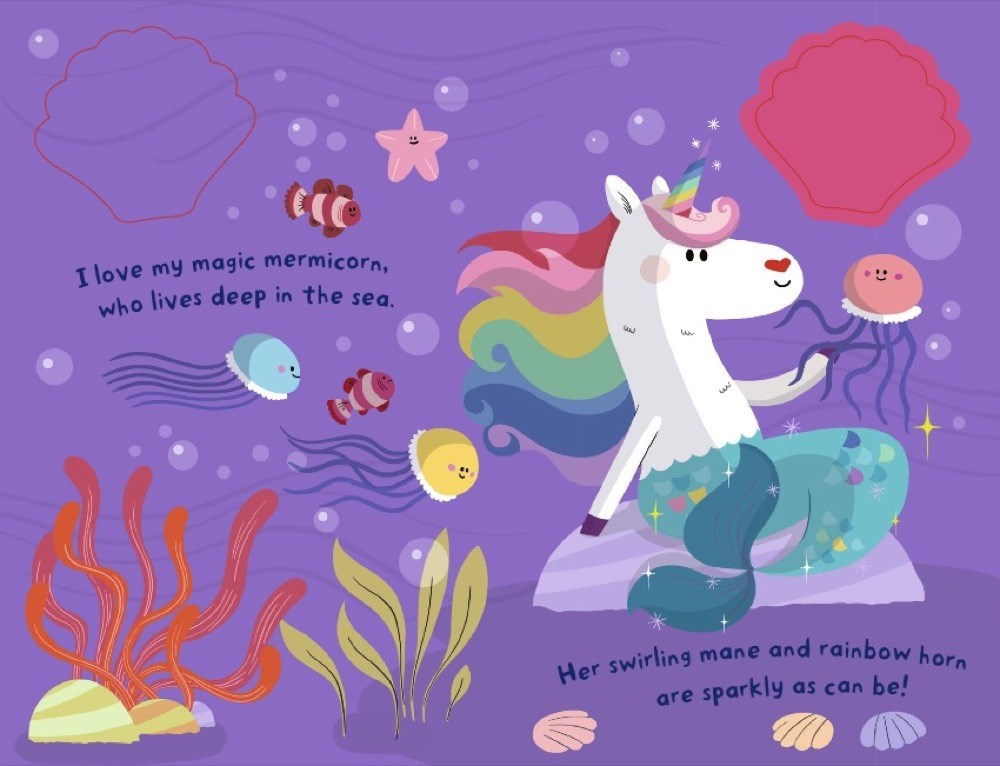 By Danielle McLean, Author & Prisca Le Tandé, Illustrator. It’s a mermaid! It’s a unicorn! No, it’s a MERMICORN! That’s right—a magical mermaid-unicorn is swimming your way in this glittery die-cut board book. This sparkly mermaid with a rainbow tail is also a unicorn, with a magical rainbow horn to match. She swims through the seas, spreading cheer and lending a helping hand to her ocean friends. This rhyming board book—with shiny foil and a colorful die-cut—will bring a smile to any child’s face (and grown-ups’ too!). For mermaid lovers, unicorn fans, and baby-shower gift baskets everywhere! For ages 2 and up.
